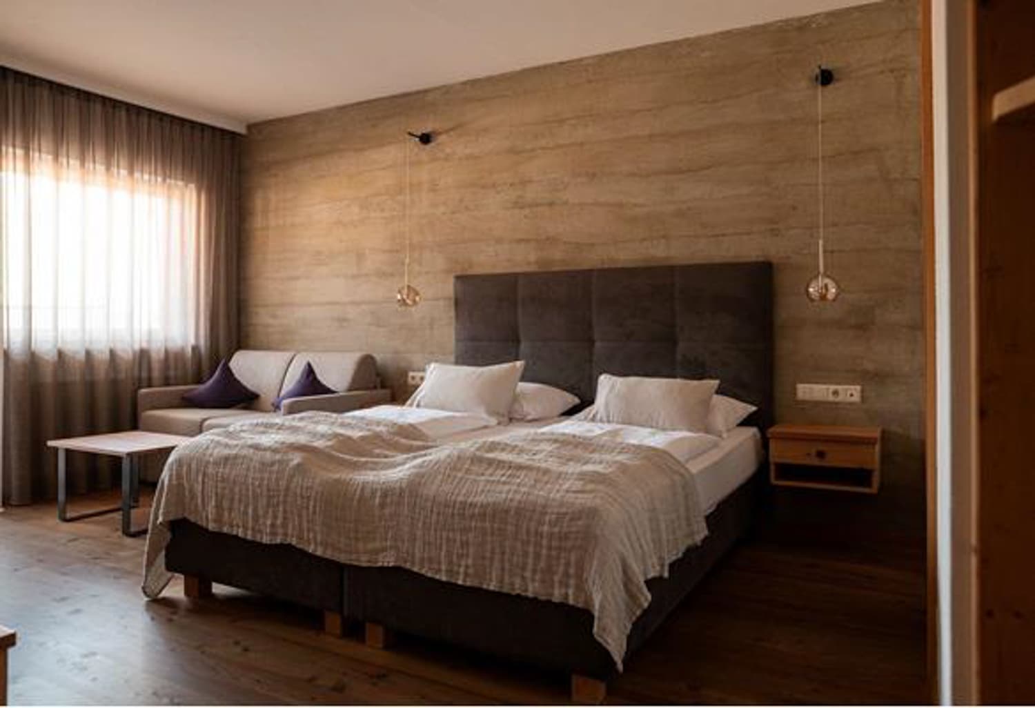 Vom alpinen Doppelzimmer bis zur Mountain Suite mit hoher Turmdecke. Eingerichtet mit heimischem Holzboden, Zirbenholz und viel Liebe zum Detail.